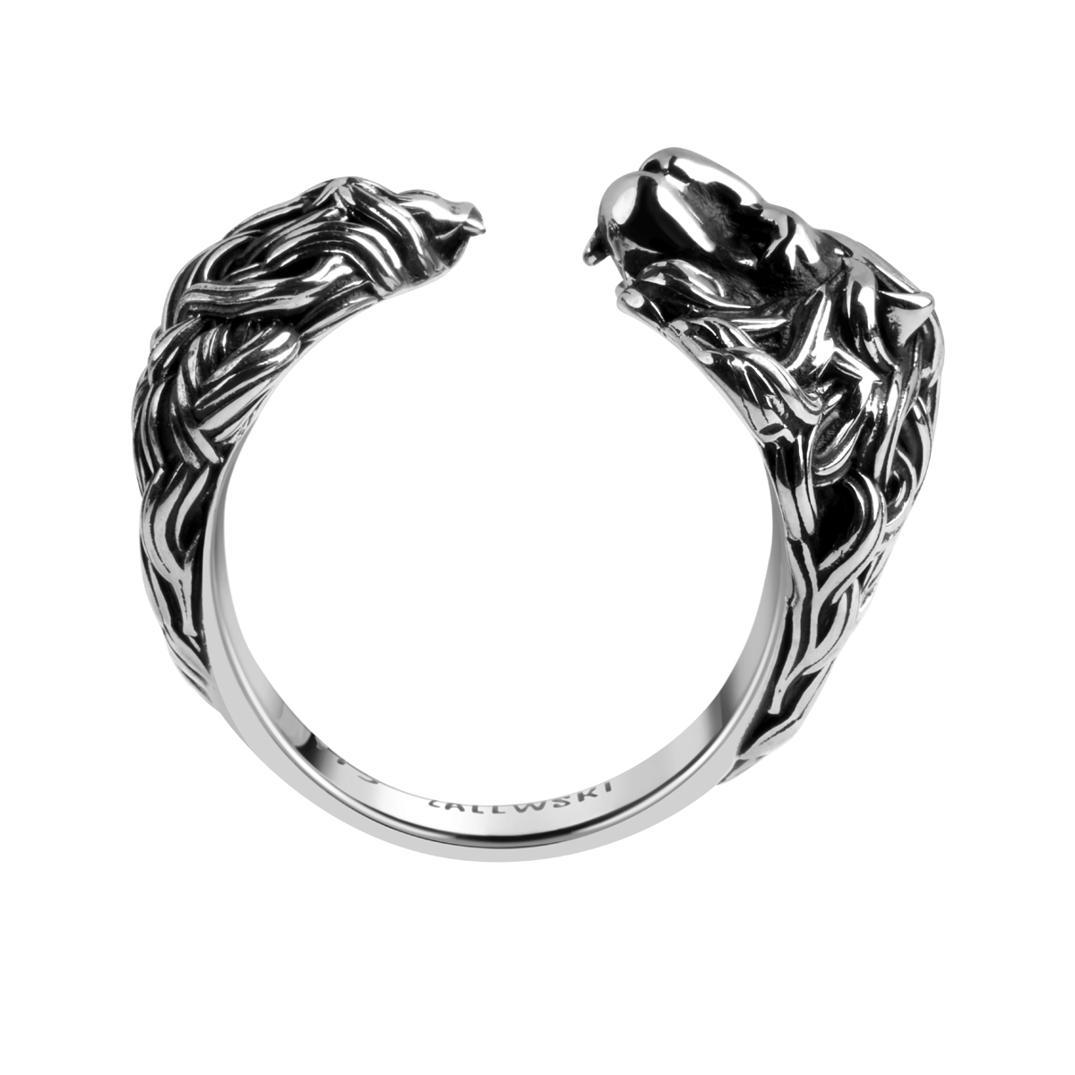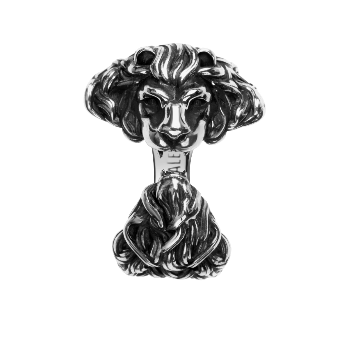 Mosazný prsten v rhodiu a zčernalém provedení. Otevřený model, zobrazující hlavu lva. Šperky patří do kolekce YES x Zalewski.
