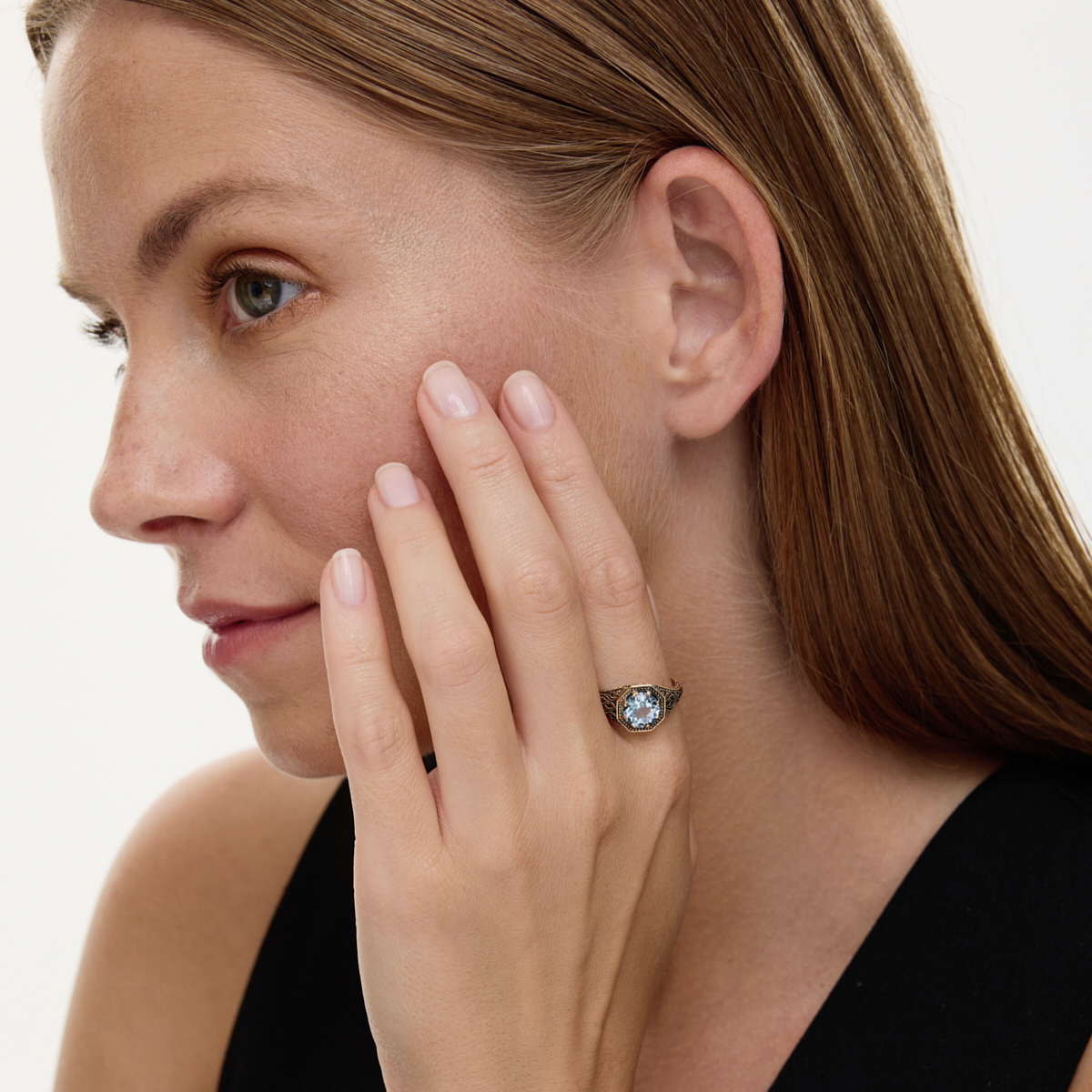 Prsten s Sky Blue topazem v centrálním prostředí s osmiúhelníkovým profilem. Prolamovaná kolejnice s ornamentálním reliéfem odkazuje na vintage styl - složitý, ale dobře vyvážený. Zlato v teplém stínu a mírné vyvýšení kamene dodávají tvaru hloubku. Šperky s charakterem, pro lidi, kteří oceňují design s historií.