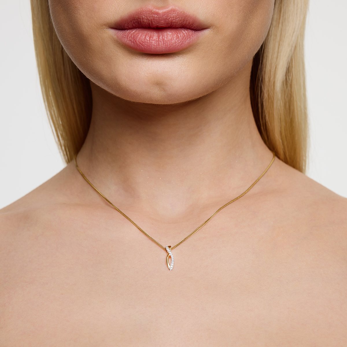 Pendant made of 585 gold in the form of a twisted line. One of the edges is decorated with thirteen diamonds, which emphasizes the elegant and classic character of the jewelry. A model for her, suitable for both everyday and evening wear.