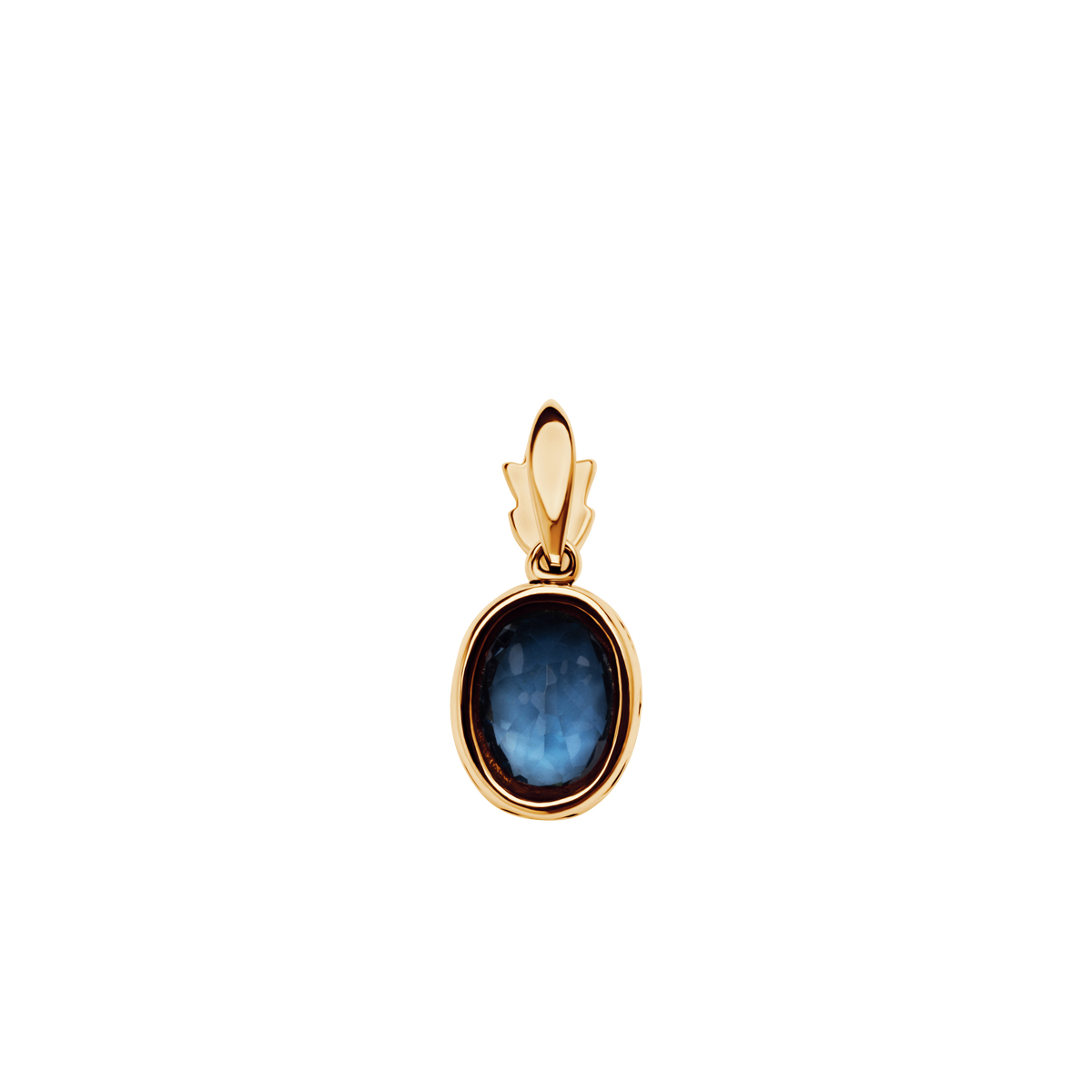 Prívesok vyrobený z 585 zlata. Zdobené oválnym londýnskym modrým topazom v ozdobnom ráme a korunovaným listovým prvkom. Kombinácia intenzívnej farby kamene sa zlatým dáva šperkům elegantný a nový. Model pro ni, vhodný pre špeciálne príležitosti.